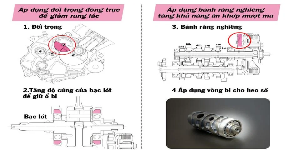 Công nghệ giảm rung lắc và tiếng ồn: WINNER R áp dụng trục cơ và trục cân bằng kết hợp bạc lót để giảm thiểu rung lắc. Đồng thời, việc sử dụng bánh răng nghiêng và vòng bi cho heo số giúp giảm thiểu tiếng ồn vượt trội, mang đến cảm giác vận hành êm ái và mượt mà.